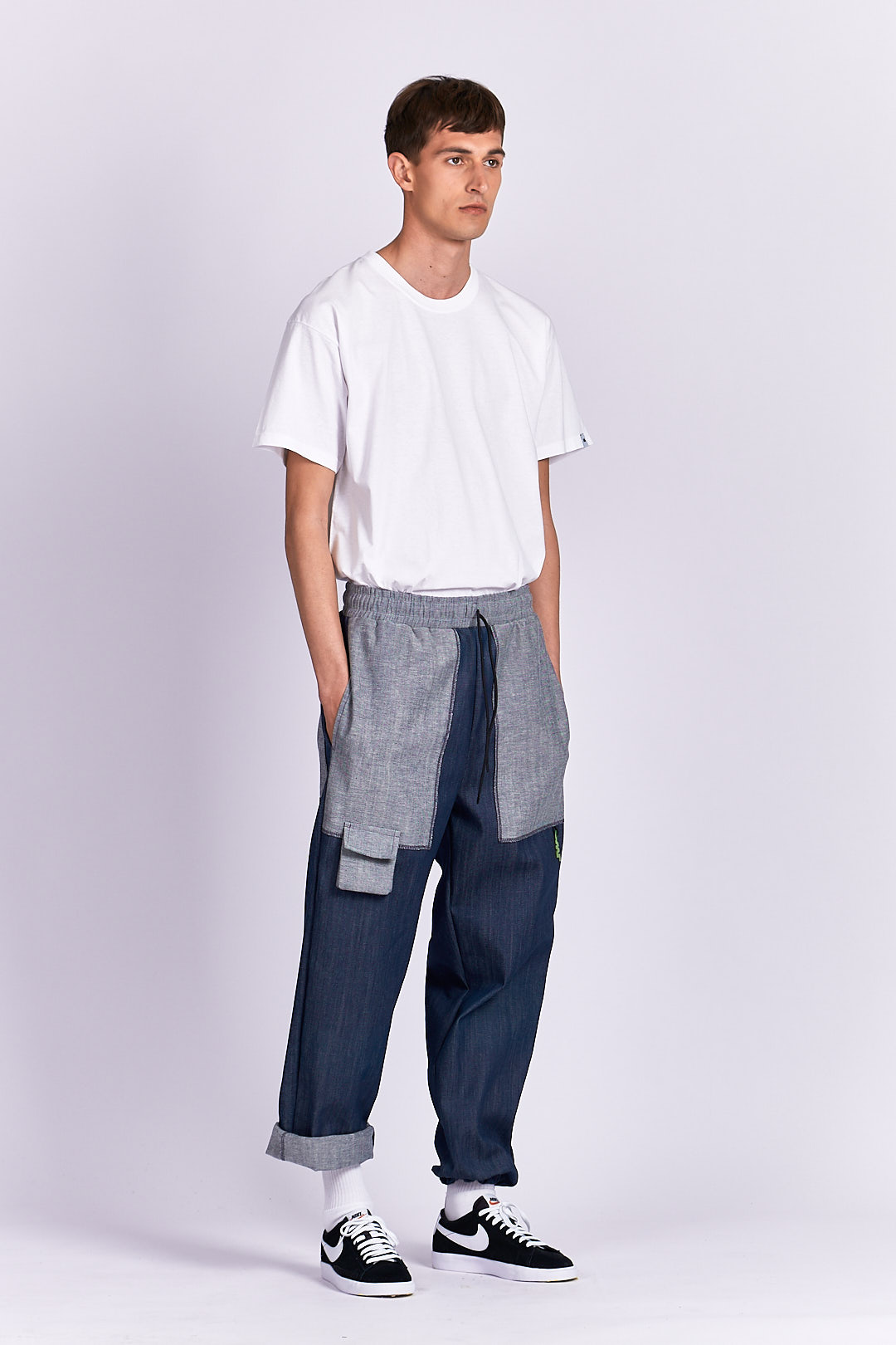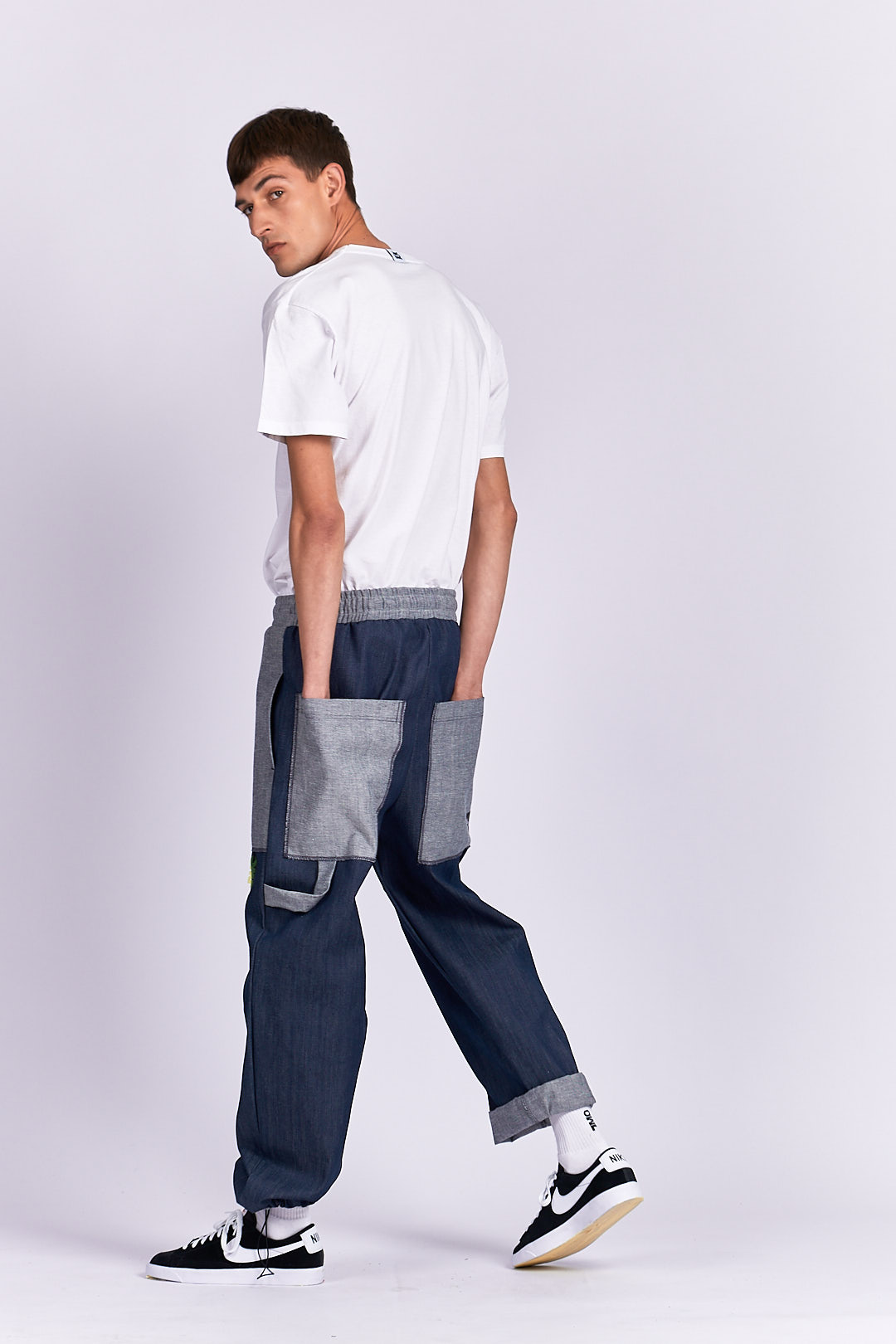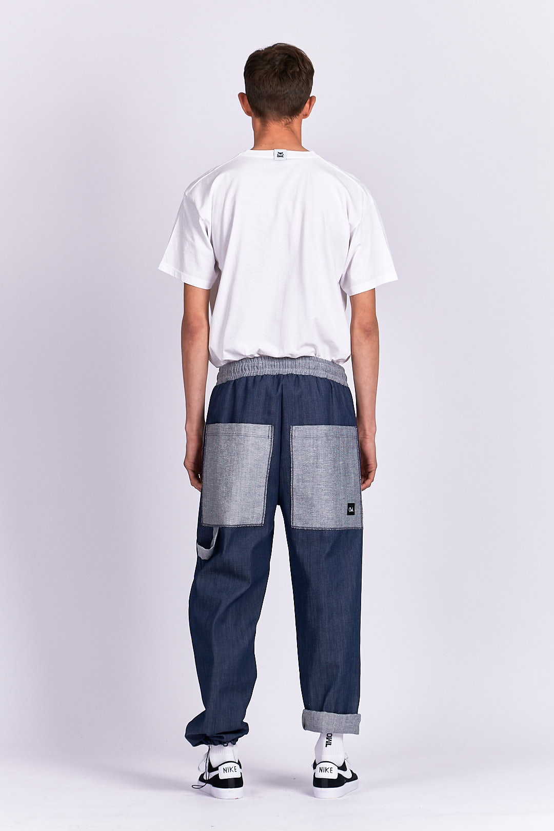 PRODUCT DETAILS Jeans material Drawstring waistband Designed to look baggy Ankle drawstring Functional back/side pockets Mini front pocket PVC owl logo detail